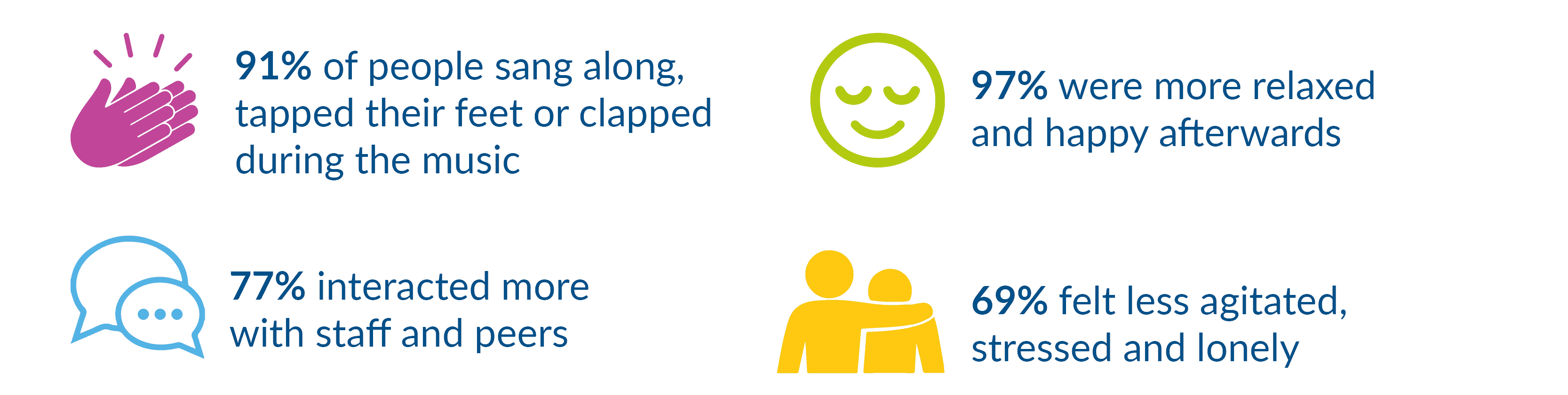 Last year 28,000 people experienced the joy and impact of our live music. As you will see, it is the personal stories that stand out. Every foot tap, person singing along, or silent reflection. Live music makes us feel more relaxed and happier. It reduces stress and makes us feel less agitated.