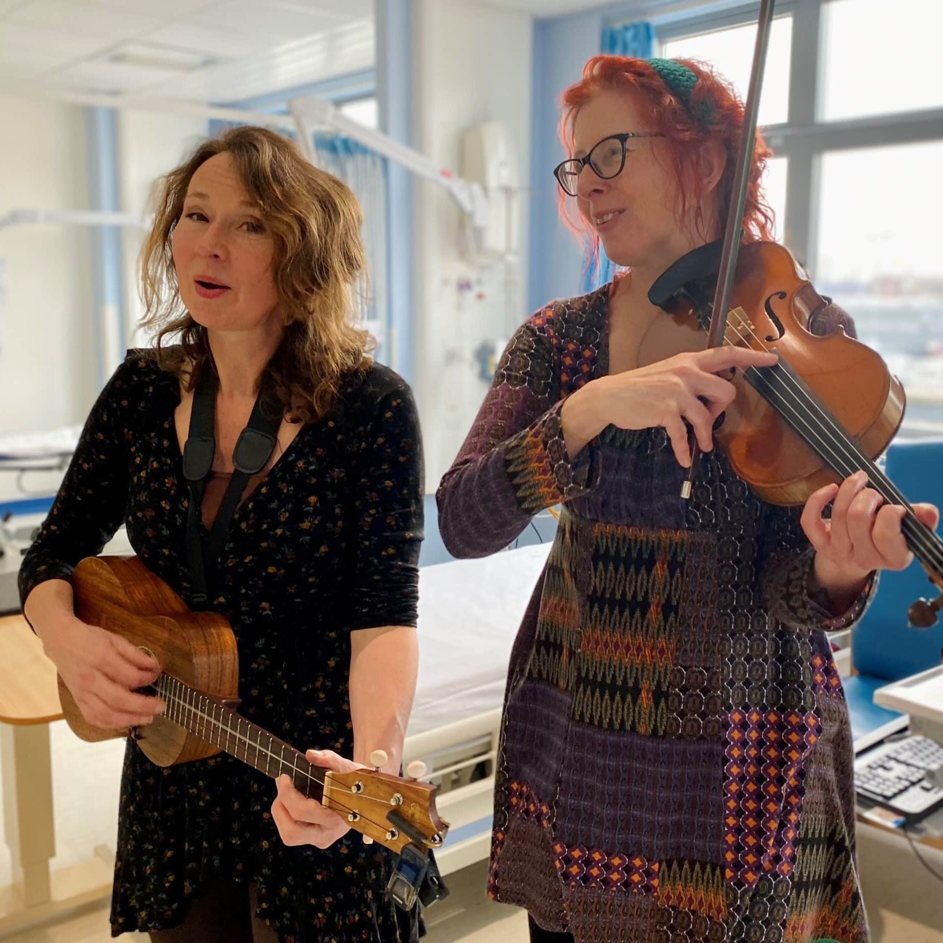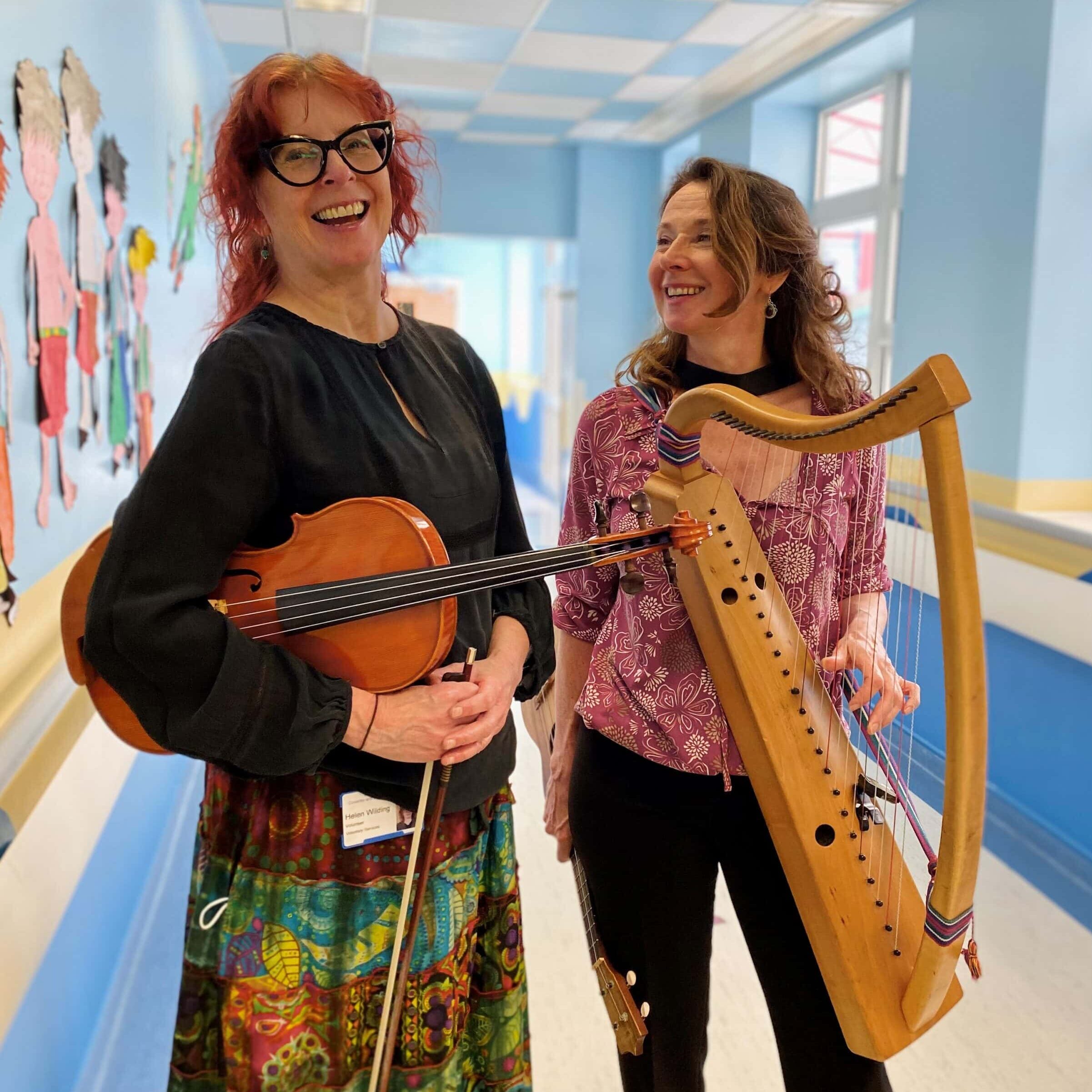 This year Annie Summers and Helen Wilding have become our first resident musicians at Coventry Hospital. The partnership signifies University Hospitals Coventry & Warwickshire NHS Trust’s commitment to making live music an important part of patient experience. Violinist Helen and guitarist and harpist Annie share uplifting live music in the oncology (cancer care) and paediatric (children’s) wards once a month.