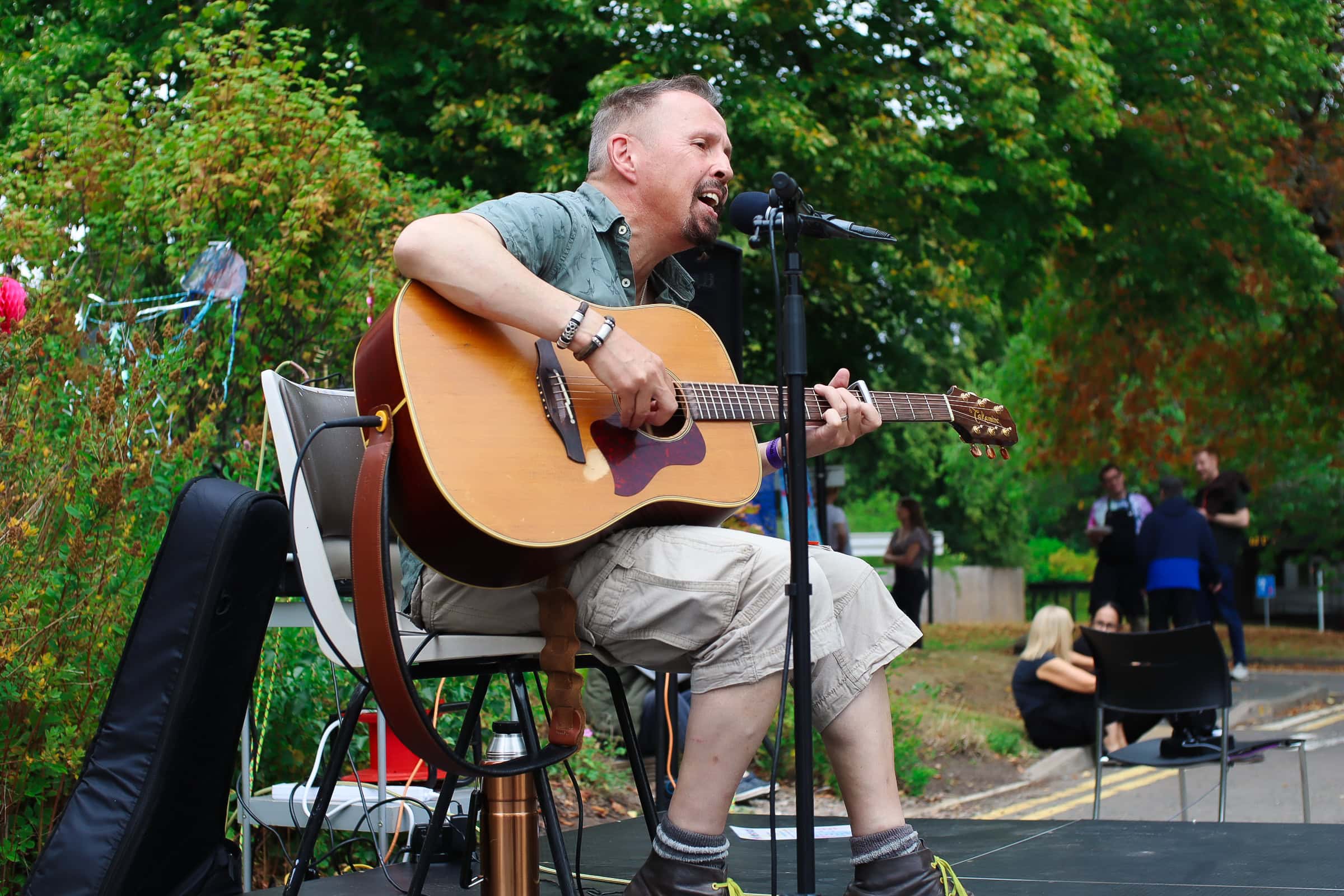 Last week, Hivestock took over the grounds of Royal Edinburgh Hospital for an annual outdoor arts festival organised by the wonderful team at The Hive. The event is designed to support patient wellbeing and featured live performances including from our very own guitarist and singer Charlie Gorman, who’s been facilitating jam sessions at The Hive for over ten years.