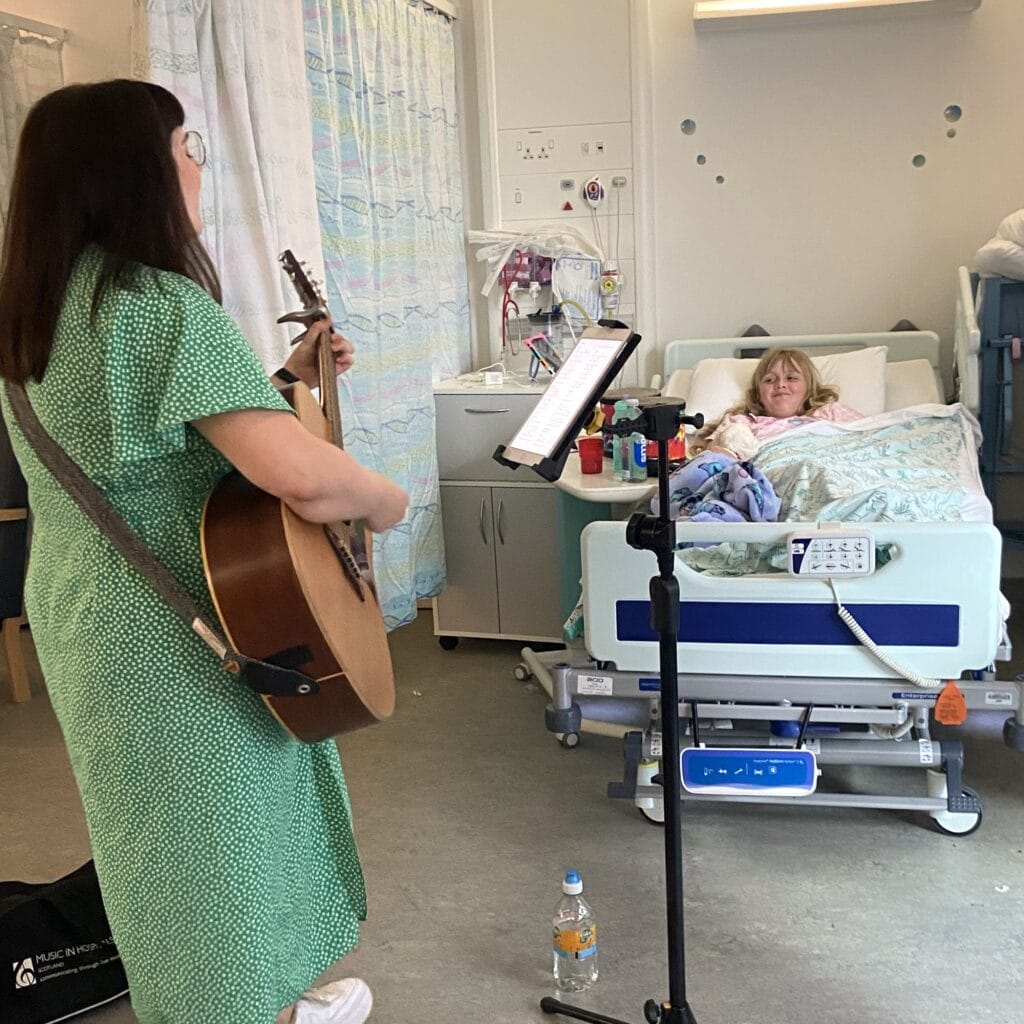 Earlier this month I was invited to the children’s unit at Victoria Hospital in Fife, where I was able to watch musician Amy Rayner. There was intimate live music at bedsides as well as in the waiting room for outpatients. The children in some of the bays on the ward were unsure about receiving music, but were encouraged by Amy who gave them instruments to join in and prompted them to finish a lyric. Amy displayed a perfect balance of enthusiasm to bring children out of their shell, while showing respect and professionalism when some children did not want to have music.