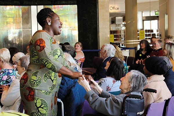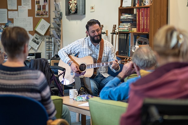Our professional musicians share live music with older people living in and visiting care homes and day centres. This helps to tackle loneliness, strengthen relationships, and creates moments of connection for people living with dementia and those who care for them.