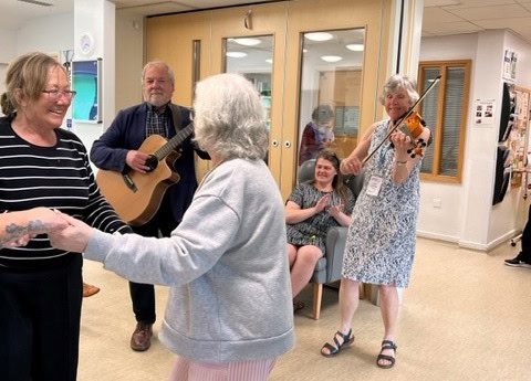 One of our regular musicians at Charlton Lane Hospital, fiddle player Moira Gutteridge, visits the ward alongside her husband Peter as a musical duo. Moira recalls the powerful impact of a recent live music experience: “Some of the staff handed out percussion instruments to the patients, and danced enthusiastically as we played, encouraging everyone to tap or clap along.